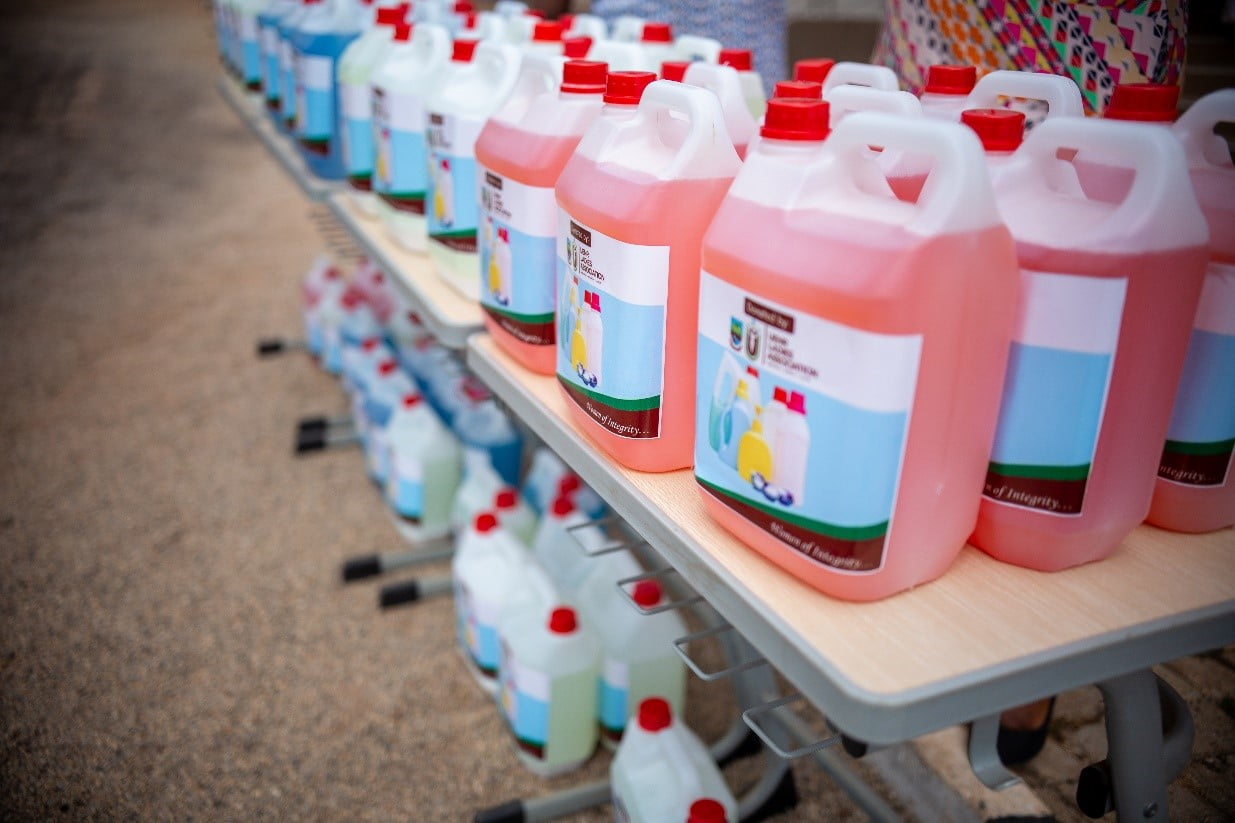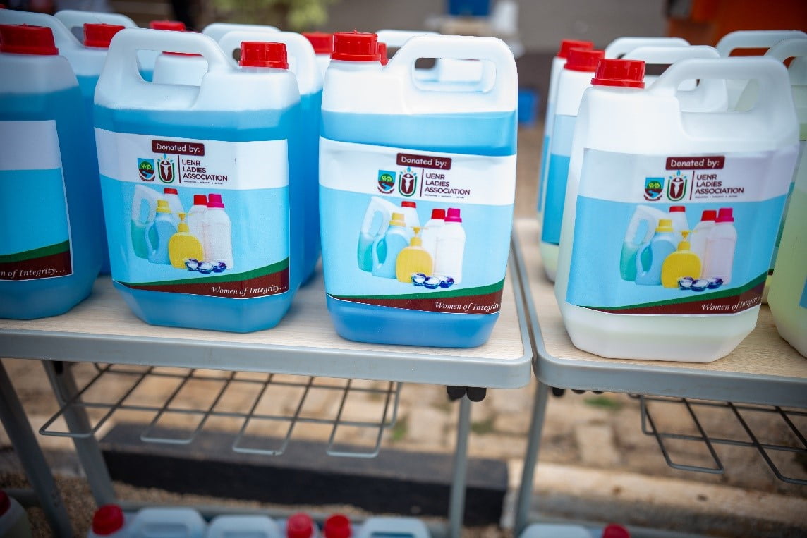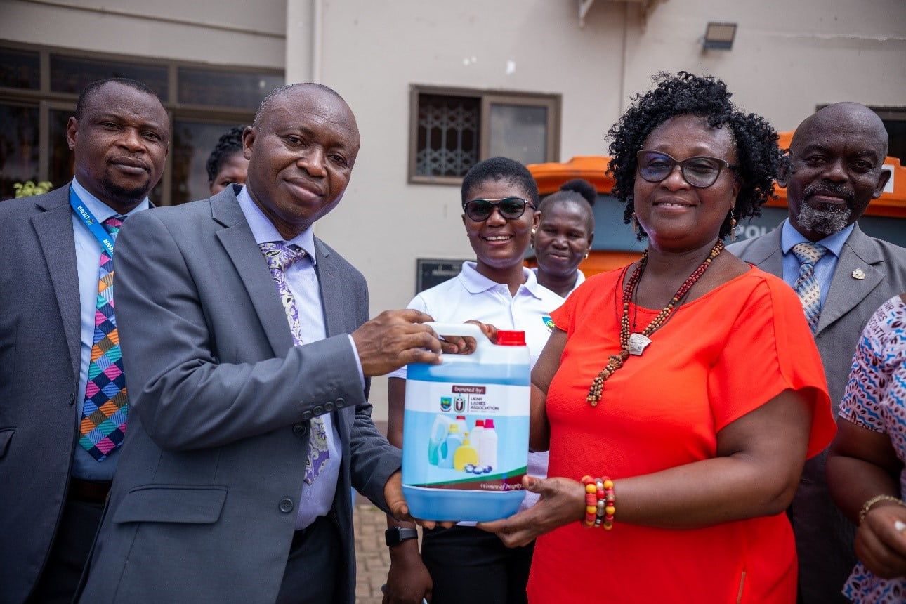 As part of their aim to unite women in the University, the UENR Ladies Association has embarked on Skills Training in detergent making for its members. In its role to help the fight against the COVID-19 Pandemic, the association has donated to the university over sixty gallons of detergents at a presentation ceremony in front of the administration. Mrs. Mary Yebo-Okrah, a member of the association, presented the items to the Vice-Chancellor – Prof. Elvis Asare-Bediako on behalf of the association and revealed that the association hopes to carry out similar activities in the future to help promote the vision of the Vice-Chancellor.